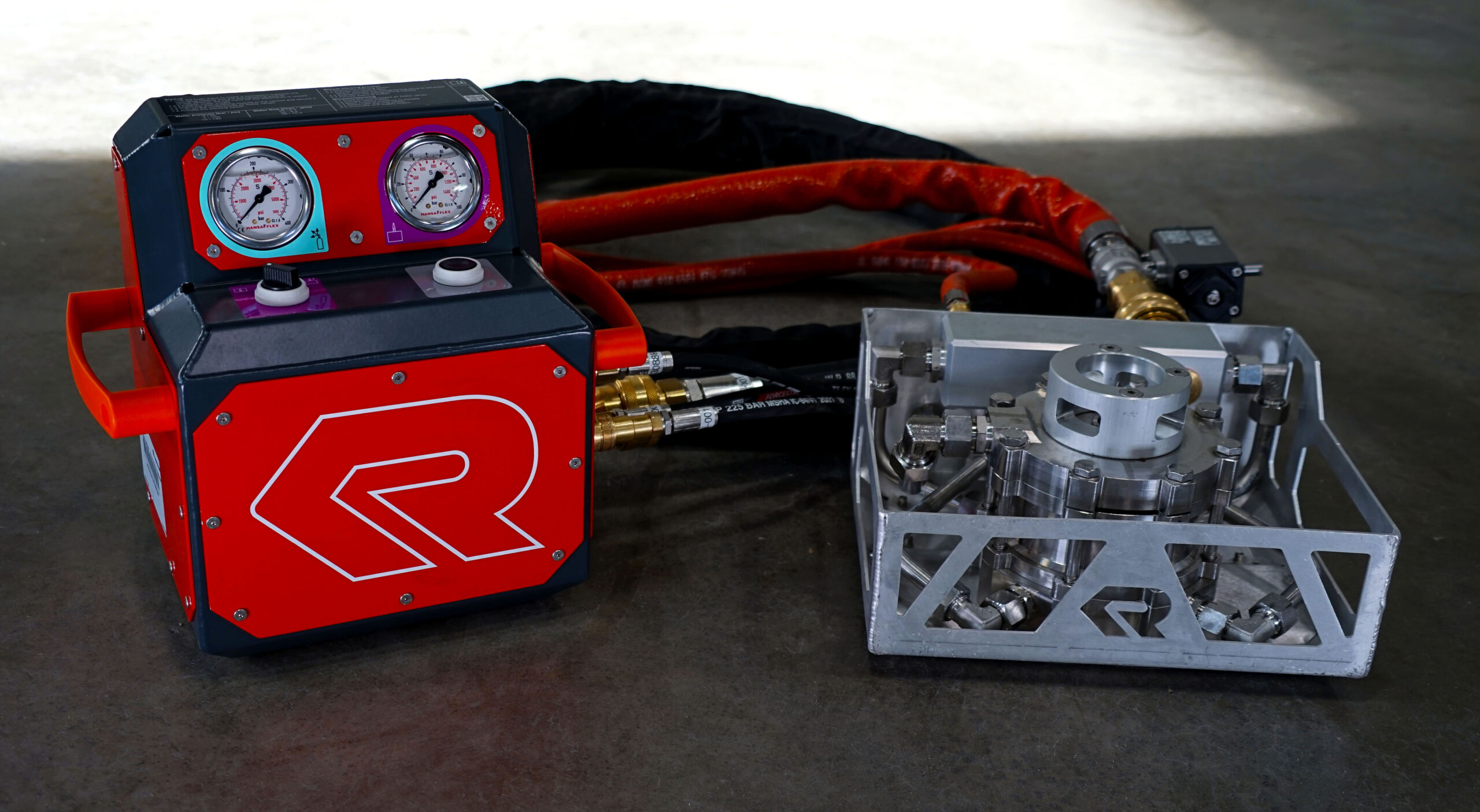 Componentes: unidade de extinção, unidade de controle e mangueiras de alta resistência